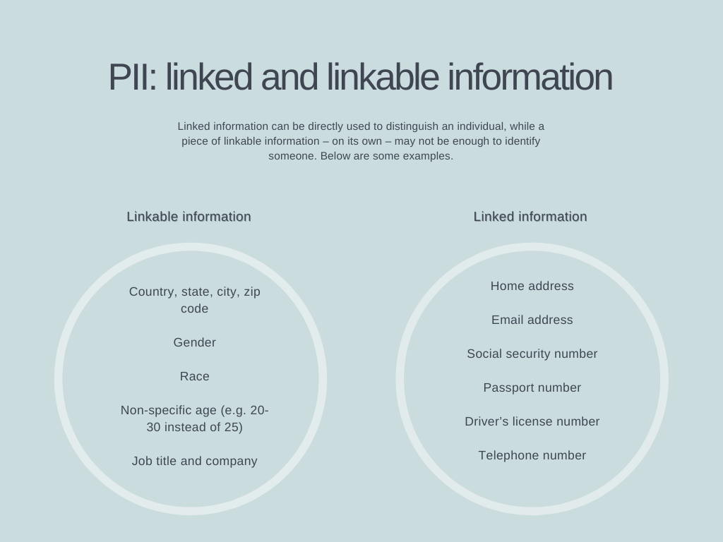 In the US, the National Institute of Standards and Technology (NIST) divides PII into two categories: linked and linkable information.