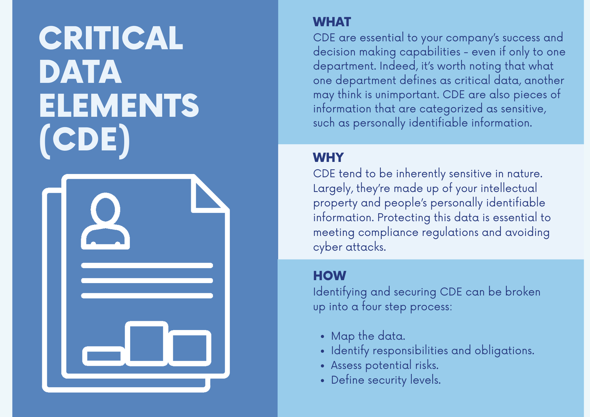 CDE are essential to your company’s success and decision making capabilities – even if only to one department. Indeed, it’s worth noting that what one department defines as critical data, another may think is unimportant. CDE are also pieces of information that are categorized as sensitive, such as personally identifiable information.
